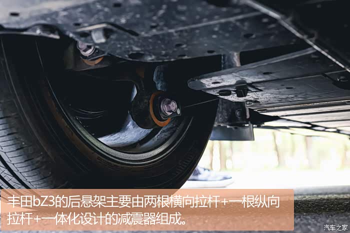 有人会问,这个车的舒适性。我也专门尝试了减速带、井盖、高速路接缝这几种路况,丰田bZ3的滤震表现依旧给到80分。丰田bZ3的经过坑洼路面时没有给我吵到的感觉,也没有给我多余的晃动,只能说结构并不能代表一切,关键还是得看调教。丰田bZ3的后悬架主要由两根横向拉杆+一根纵向拉杆+一体化设计的减震器组成,相比大部分采用独立后悬架的车子那种分体式的减震器来说,车身的弹跳能量和车身重量都被一体化设计的减震器吸收化解,留给三根拉杆的力都是纵向的,所以不存在强度问题。