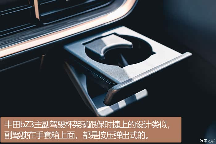 在我体验丰田bZ3的过程中,我还发现了几个非常隐藏的设计,我不说你们肯定费劲能找到。一个就是杯架。丰田bZ3主副驾驶的杯架就跟保时捷上的设计类似,主驾驶在方向盘左边,副驾驶在手套箱上面,都是按压弹出式的,很有意思。