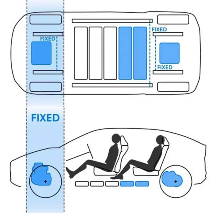 由于电动车无需复杂的变速箱,也无需从前到后的传统轴,电机的布置可以比发动机更为灵活,因此燃油车发动机变速箱传动轴的位置都可以空出来,与此同时电动机可以更进一步靠近四个轮子。同样长度的汽车可以多出将近半排座位的空间来,四个轮子则可以塞入车辆四个角落,故而称为“四轮四角”。
