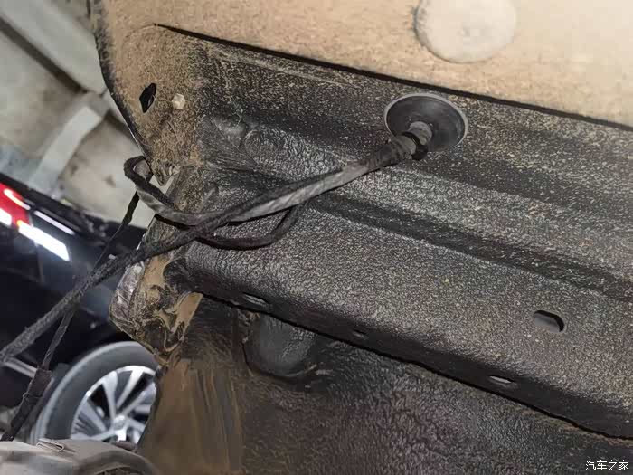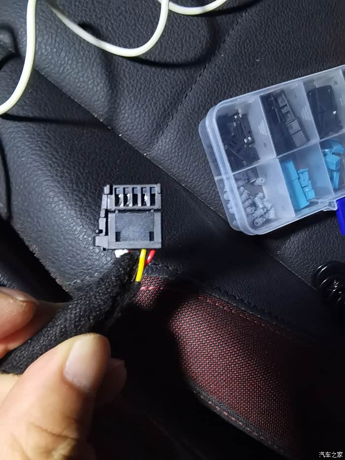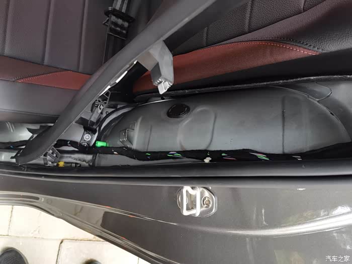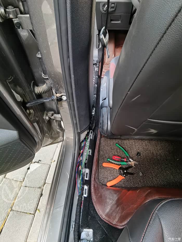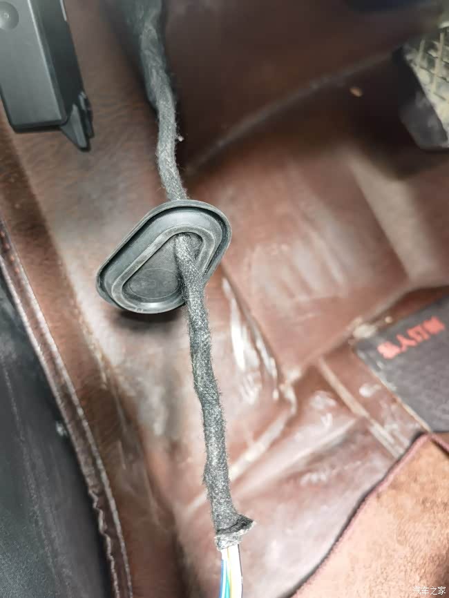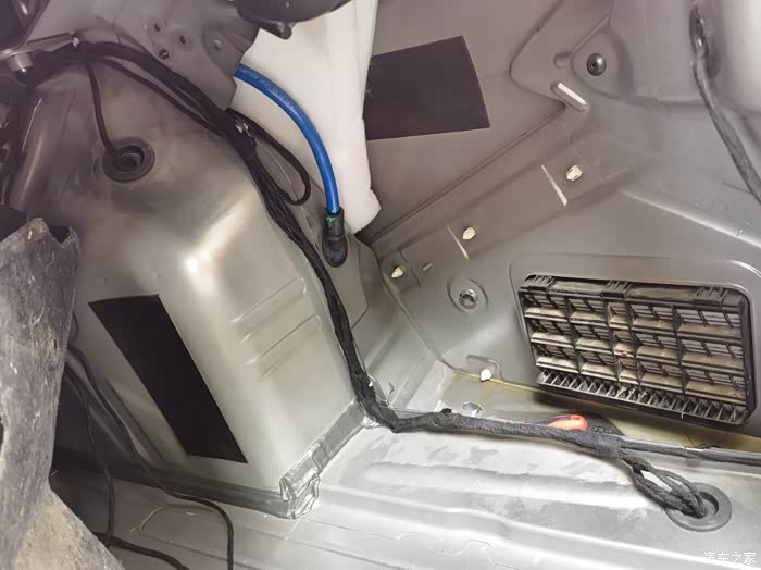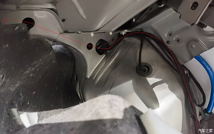 后加的线束沿着原车线束穿越座椅靠背后面的横梁时穿横梁到车身左侧