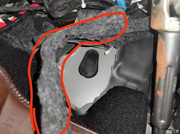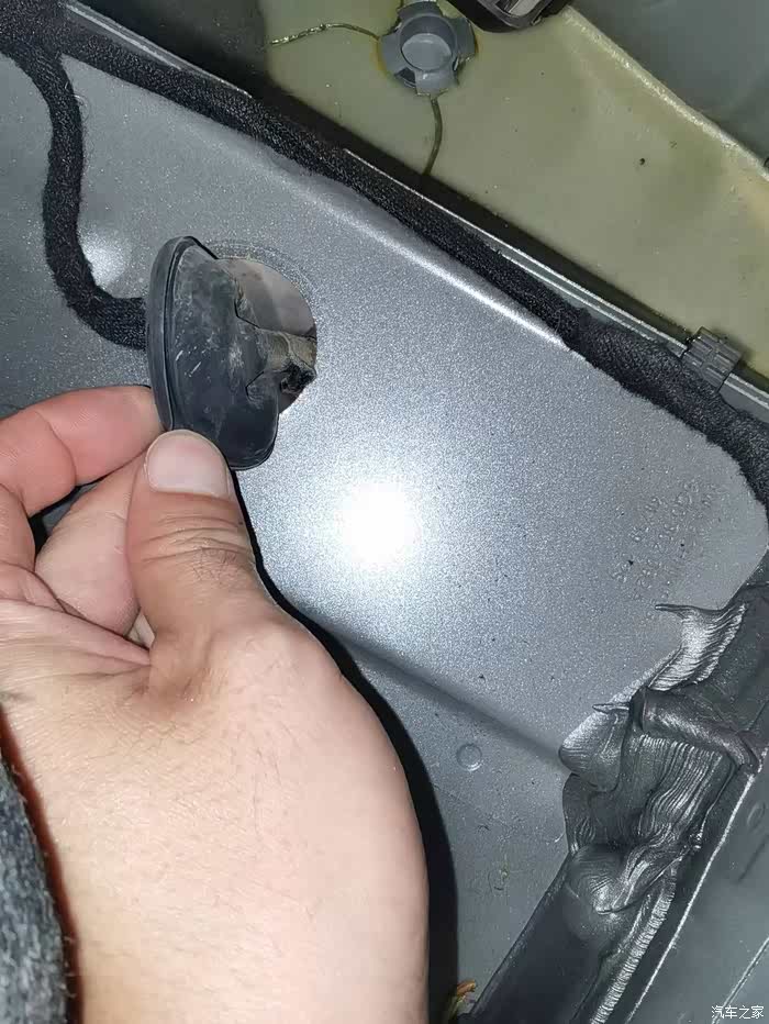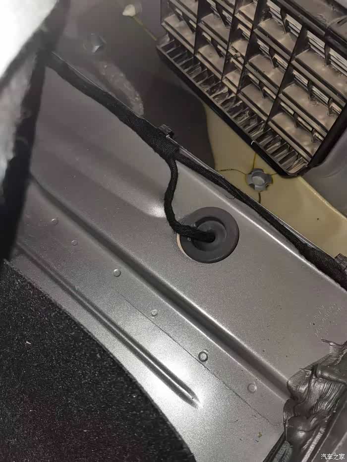 将后备箱右侧的内衬掀开,找到原车线束的孔位。