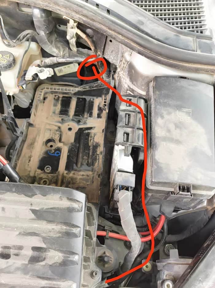 机舱线束大致沿着红线所指路径穿到驾驶员脚部位置