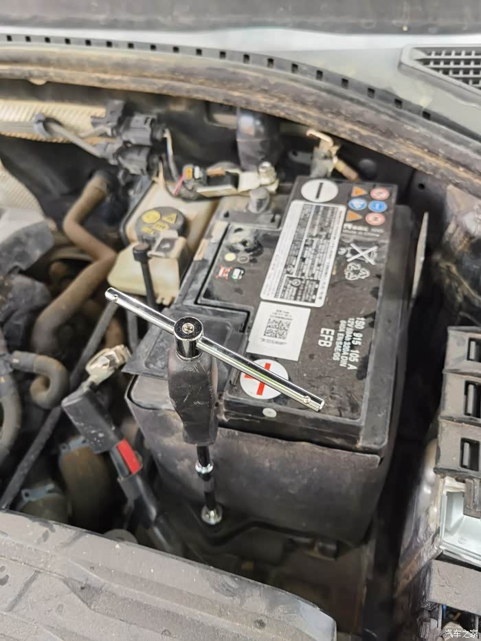 使用13mm梅花扳手将电瓶固定螺栓卸下