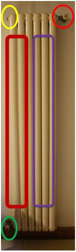 请大家帮忙啊,如图所示,家里的暖气红色框的一半热;紫色框的一半不热;如何操作让不热的部分热起来呢?有红绿两个阀门,还有黄色的放气孔。