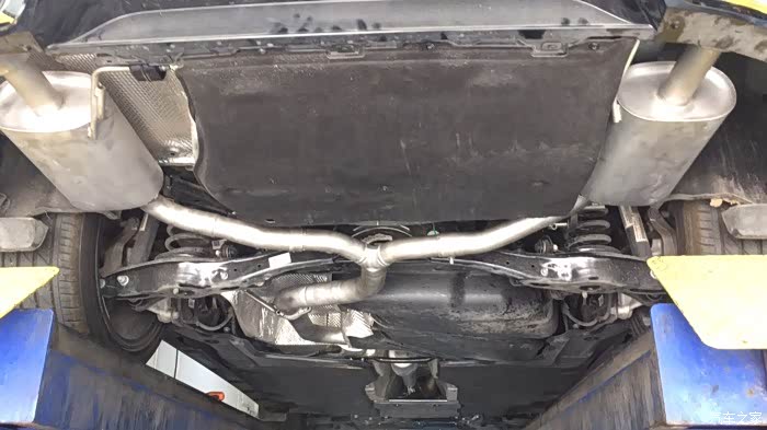 拆卸原车排气不需要拆卸后桥,只需要在尾鼓前来一刀就可以顺出来(迈腾底盘很规整,有很多抗氧化衬板和隔热板