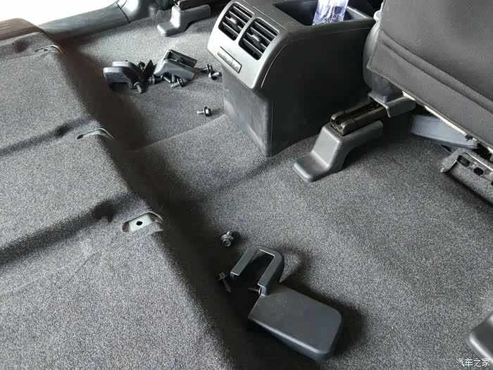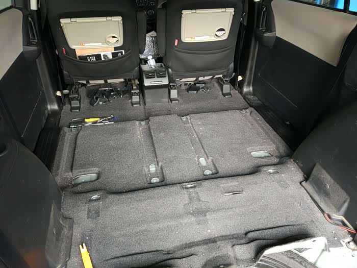 两排座椅完美拆除。这是露出的地毯,上面散落着螺丝和盖子。用这个工夫打扫一下。