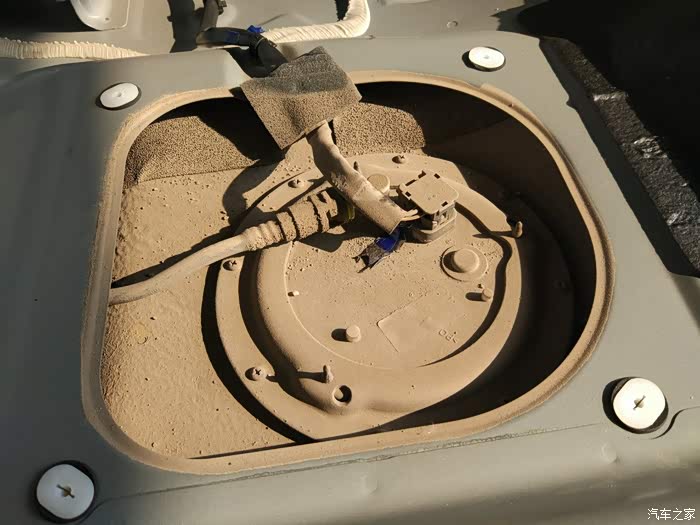 折掉四方形黑盖子,露出汽油滤清器总成的真面目。一层灰。因为这下面是油箱,是在车厢外。今天才知道,这下面对应的大包,才是油箱。一直以为的油箱,其实是备胎的大包。
