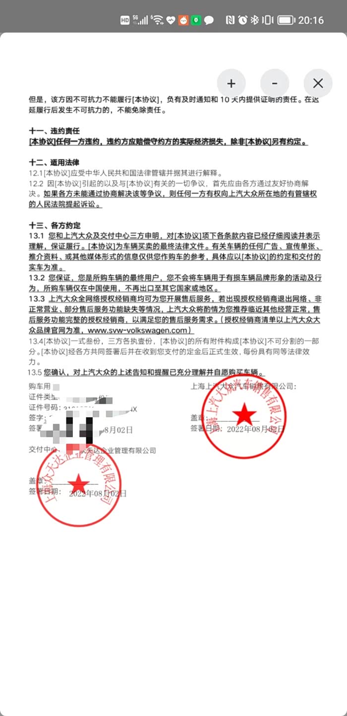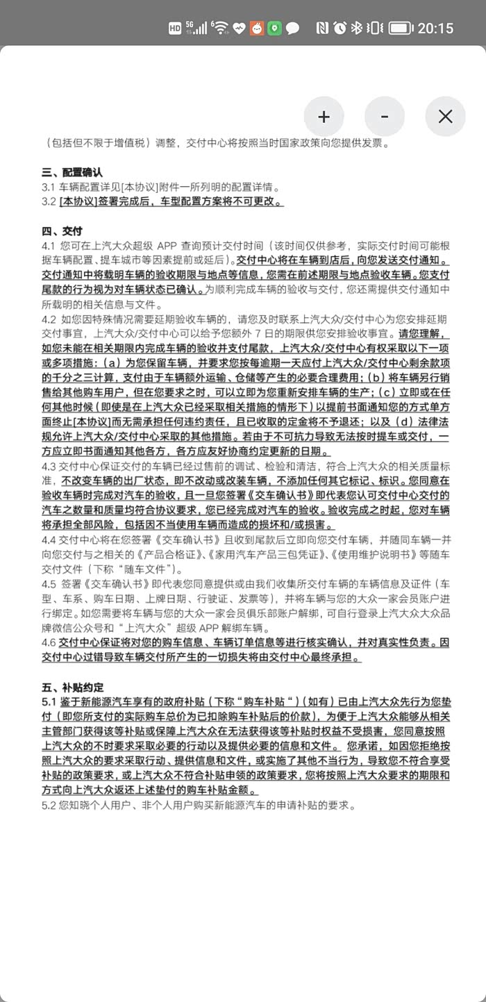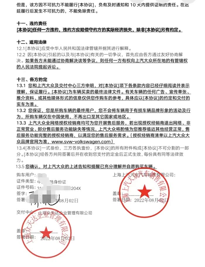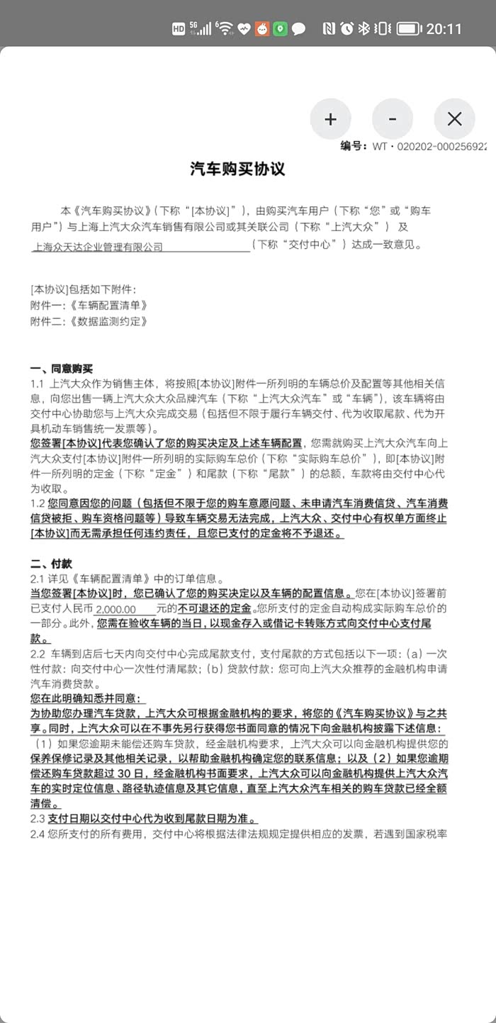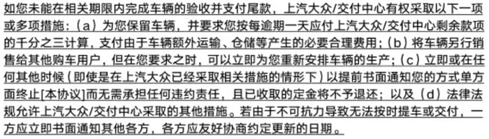 最后再完整地贴一下大众法务的“得意之作”,在线格式霸王合同,供各位要订车的车友提前研究一下,争取避坑。