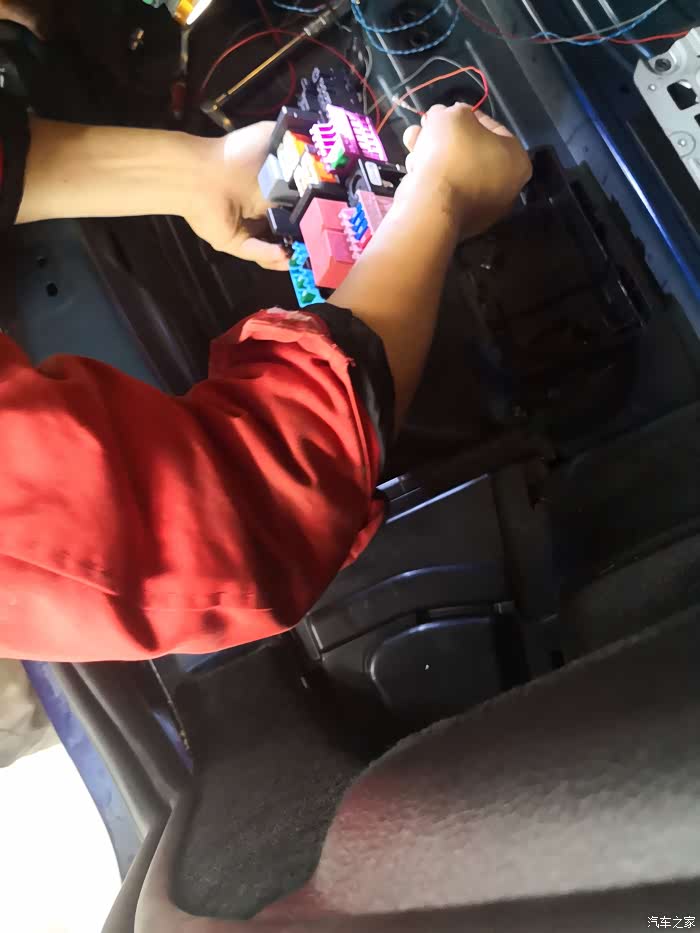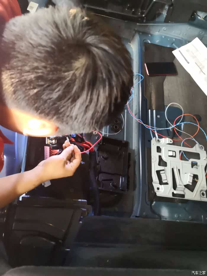 位置在这里,我标注的位置,靠车门边的地毯下面,我是和修理工一起,一个人使劲抬地毯,一个人打灯看,确认安装位置后伸手进去插的扣子,所以没拍图