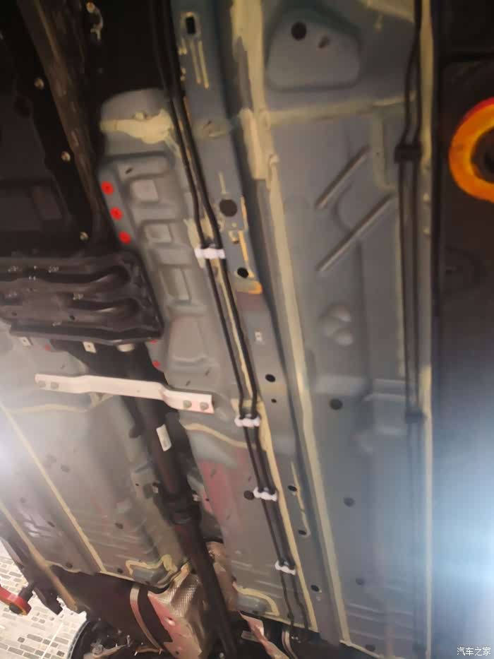 排气管,护板等等的地盘附件均需要拆除,不然无法做到效果最优化,可以看到地盘完全没有地盘胶的覆盖,就喷了点漆