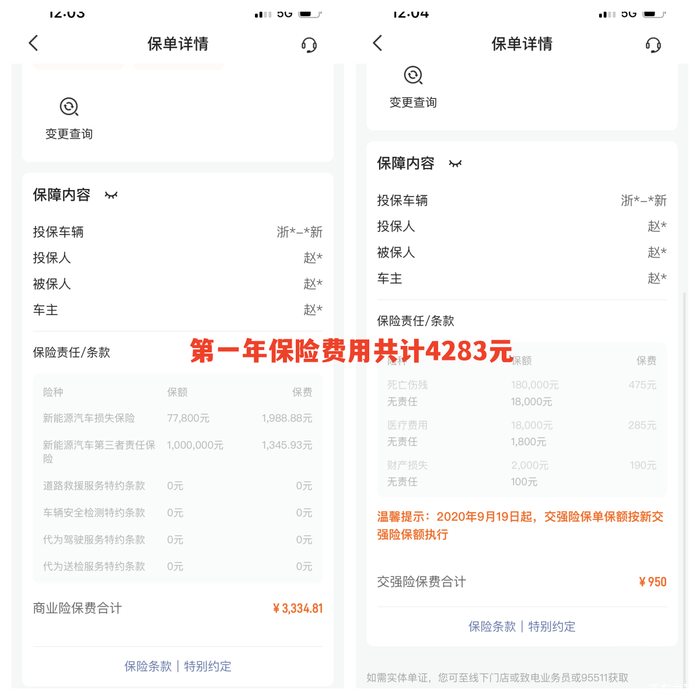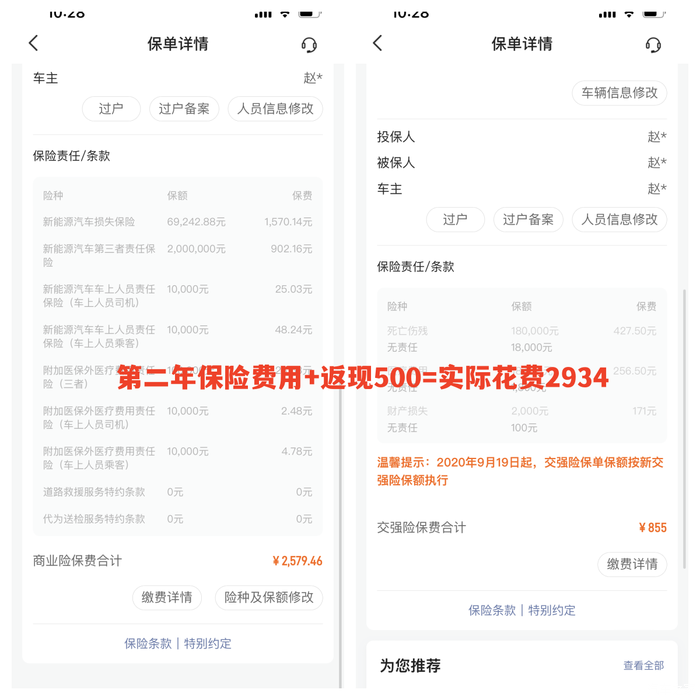 保险的费用第一年偏贵一点,是12期免息贷款买的,保险也是在店里买的,总保费是4283元(车损1988+三责1345+交强950),没有出过保险,第二年保费还是直接原保险公司续的,总费用是2934元(车损1570+三责902+车上人员司机险73+医保外7块+交强855-返现500)。