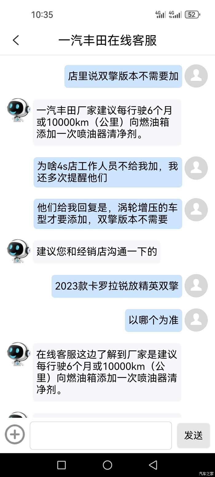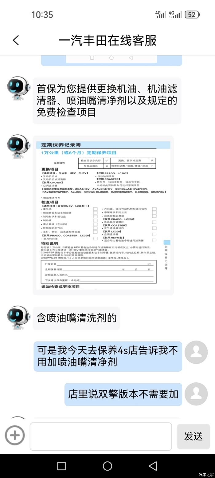 各位友友们,车型双擎混动的你们保养时候有没有加喷油器清净剂,首保的时候4s店叫我不加,2万公里保养另外一个4s店要我加,搞迷糊了