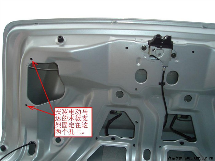 安装支架 — 使用有一定刚性,即坚固不变形的材料制作,可选厚度8mm以上的木板或密度板即可。安装支架的作用是:在后备箱盖上固定电动马达。