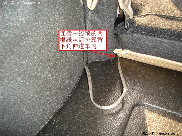 与中控锁相连接的导线可从后排座椅靠背底部穿进车内。