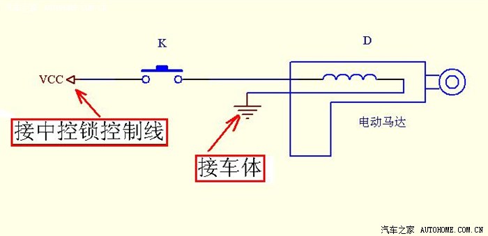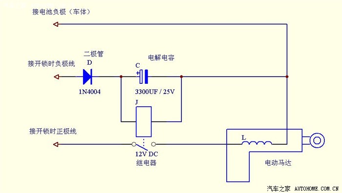原理图说明:“接开锁时负极线”也就是锁车时的正极线(红蓝线)。按下锁车按钮时,电解电容C充电,同时继电器J动作,触点闭合,此时电动马达的A端接的是负极,B端接的也是负极,因此马达并不动作。松开锁车按钮,电解电容C储存的电能维持继电器J的吸合状态,此时再按开锁按钮,使得电动马达A端接正极,B端接负极,马达头做缩进动作,后备箱被打开。二极管D的作用是,保证电解电容储存的电能全部通过继电器J释放。由于电解电容储存的电能有限,当使用3300uf的电解电容时,开后备箱的动作要在2秒钟内完成;若使用2200uf的电解电容时,需在1秒中内完成。