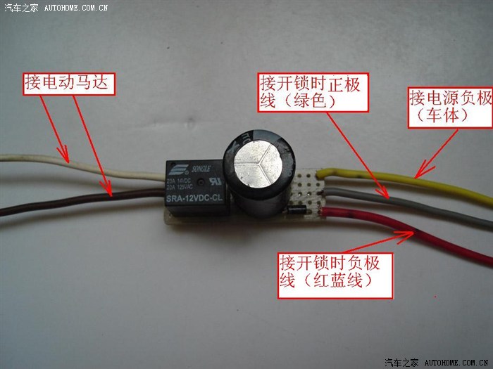 原车中控锁有两根接线,例如天语尚悦车,一根是红蓝色的线,另一根是绿色的线。锁车时,红蓝色的线为正极,绿色线为负极;开锁时,红蓝线为负极,绿色线为正极。