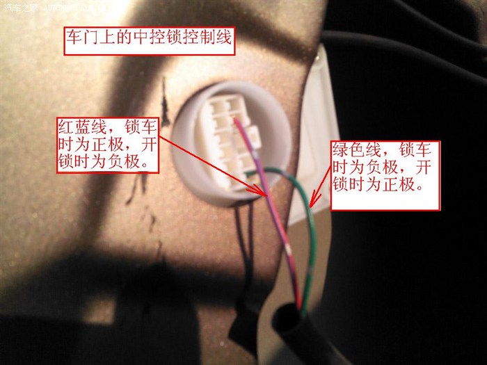 按原理图接线,图中“接开锁时负极线”就是原车中控锁的红蓝线,“接开锁时正极线”就是原车中控锁的绿色线。