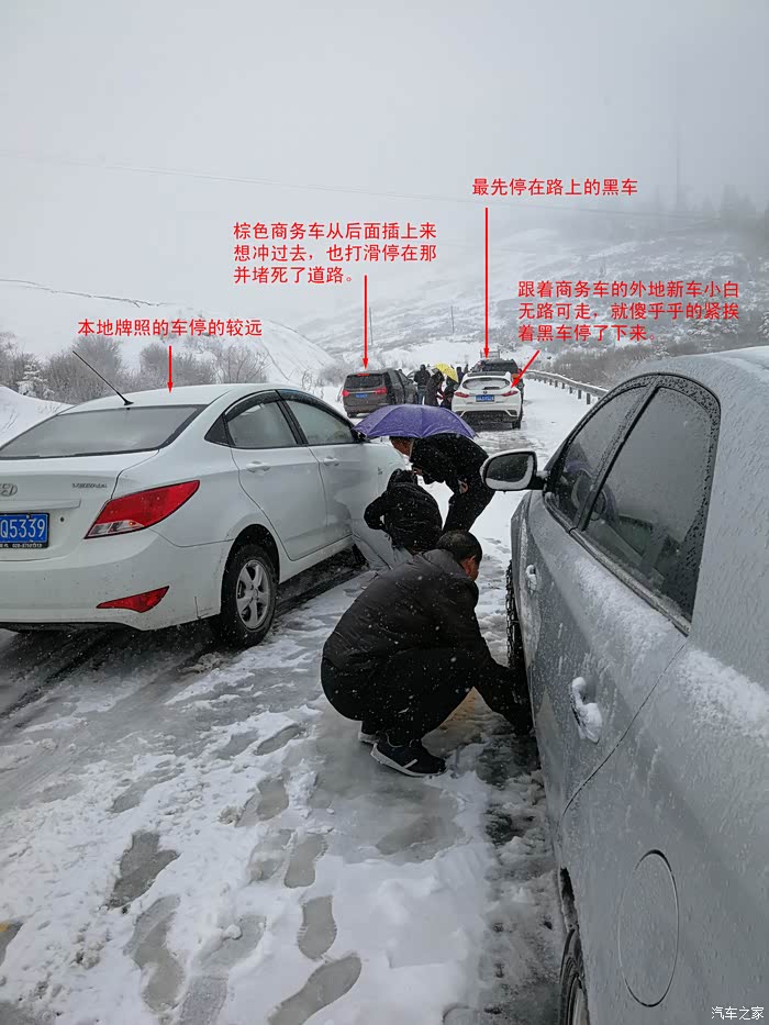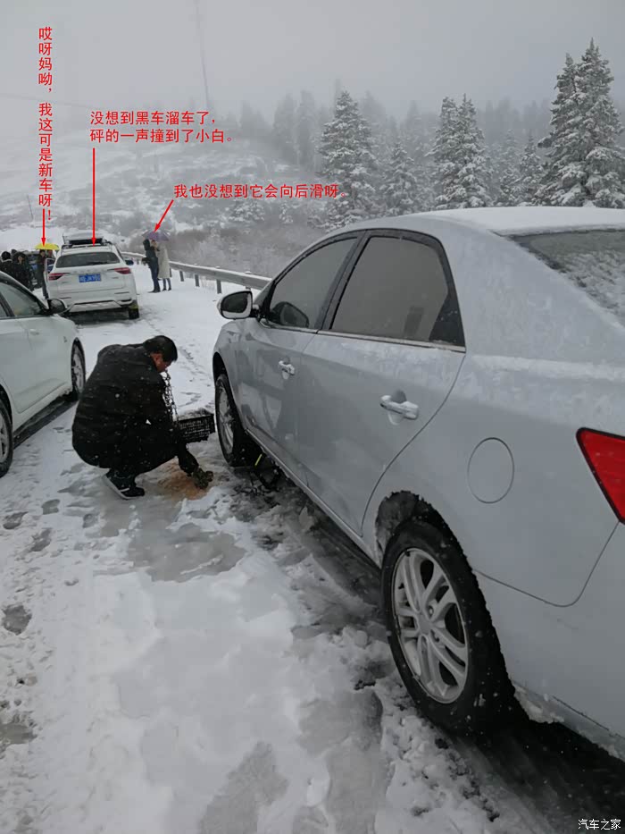 好了故事来了。转过一个弯继续爬坡时,前面的黑色车突然停在了路上,挡住了道路,我也被迫停车下来查看,原来是前车打滑走不了了。我想从他旁边绕过去,可是再起步时我的车也打滑了,试了自动档起步、手动档起步和先退再进的办法都不行。只好后退离前车远一点,靠边停车让出道路,并在车后弯道口的地方摆放了三脚架,做完了这些才安心的给车加挂防滑链。然而后面陆续过来的车.....