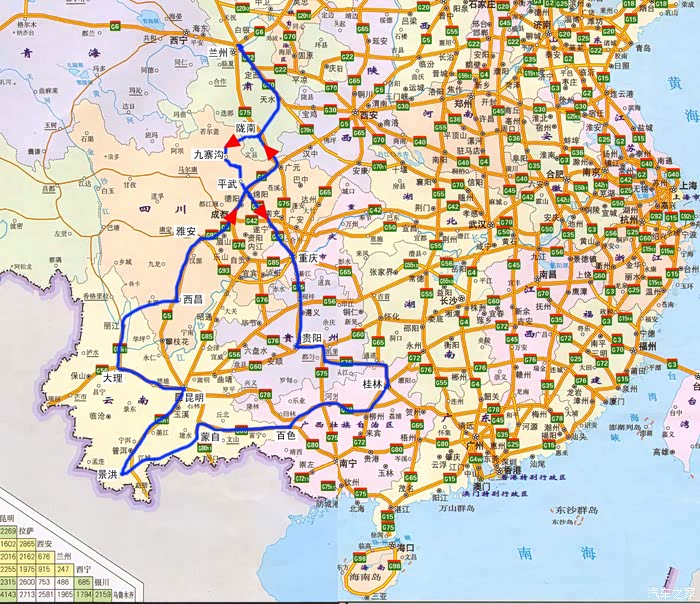 路线行程介绍:由于一直以来对九寨沟、桂林、西双版纳心存向往,所以,这三处肯定必达,其它城市是按照每天行程都不超过600公里的要求规划的,因为夫人要求只能白天开车,坚决不开夜车,确保出行安全。路线、方向是从兰州出发经陇南、九寨沟后顺时针环绕。