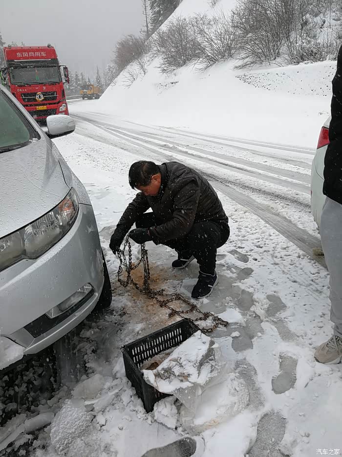 我放的三脚架很好的警示了后面的大车,给我留下了安全距离。再说一下这防滑链,平时装在黑筐里,一般进入冬季就会随车带着,夏季就取出来以减轻车重。这次出行本已取出来不想带了,但往家里搬又嫌太累就懒了一下放了回去,那料到竟然在这发挥了关键作用。