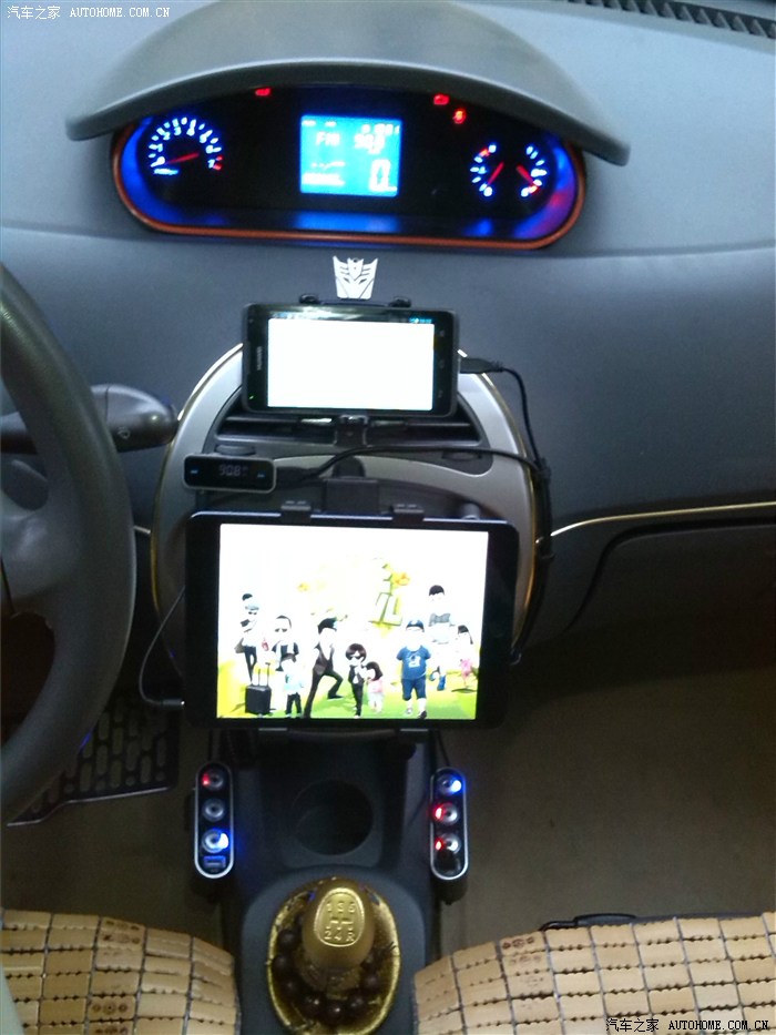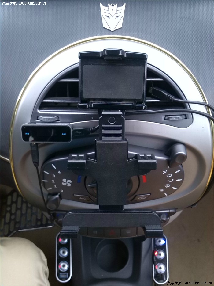 上面那个是原先的手机导航支架,充电器线、FM发射器放的位置兼顾ipad mini和手机耳机孔,可以随时用汽车喇叭播放导航声音和音乐,酷。。。
