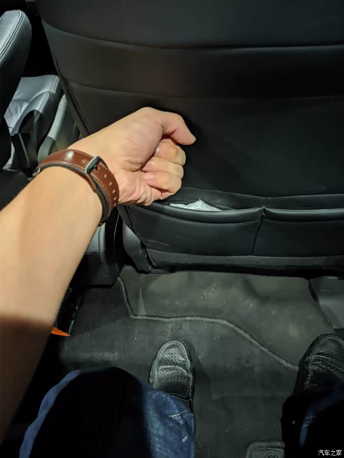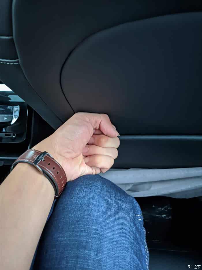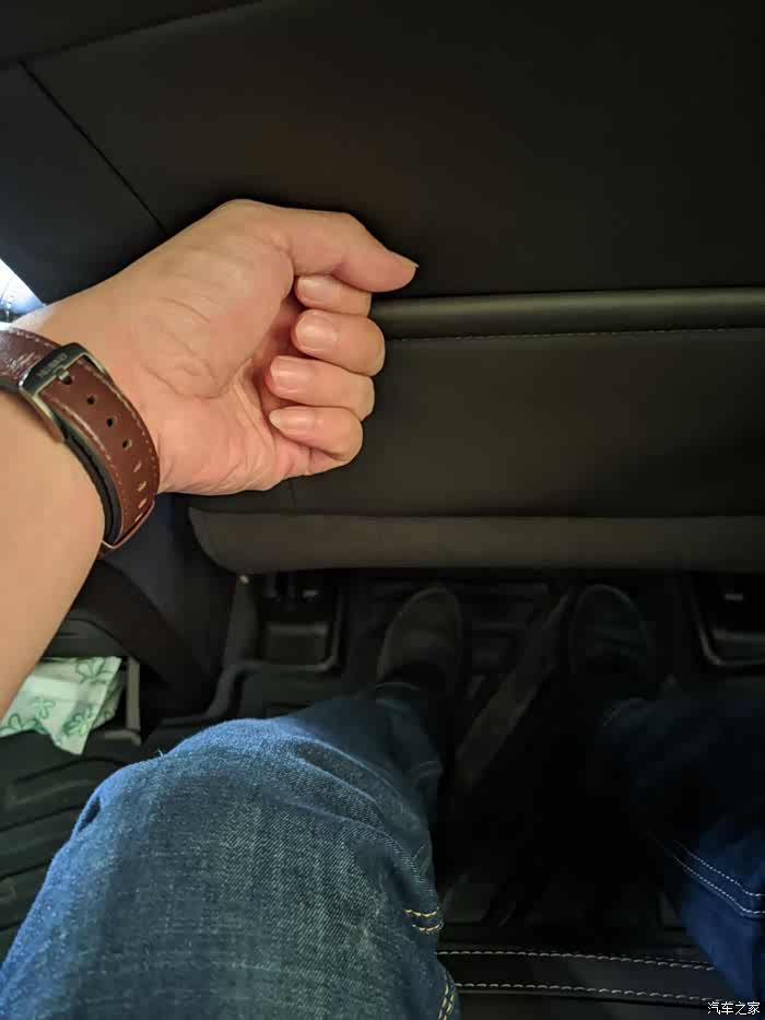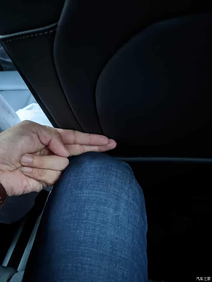说说二三排纵向空间测试结果。先说我的测试方法:考虑到每个人的驾驶习惯不同,坐姿、前后位置选择差异比较大,在驾驶座测试可能会有比较大的误差,所以我测车内纵向空间的时候,都是在副驾驶一侧,第一排留一拳,然后看二三排是什么情况。