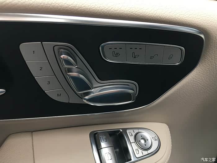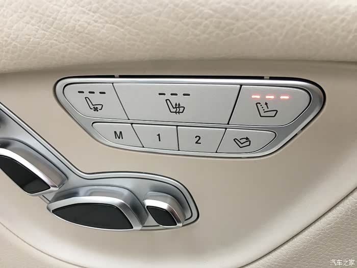 新一代奔驰的座椅调节和车窗控制按钮比前代的好看太多了,充满了金属质感,前排座椅具有加热和通风功能