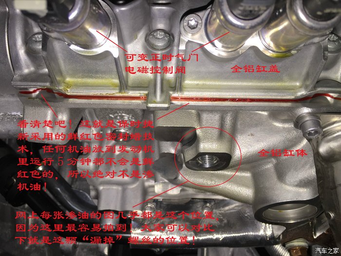 这是右侧的图片,平常很少看到,可见周边一圈都是这种红色的密封蜡,如果发动机渗油可以渗的这么均匀,那也是醉了!