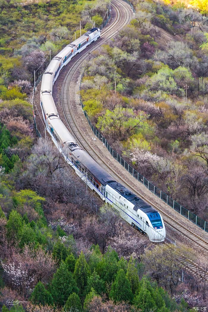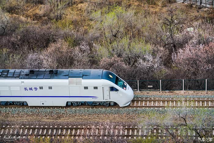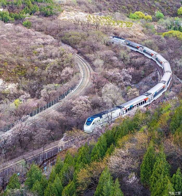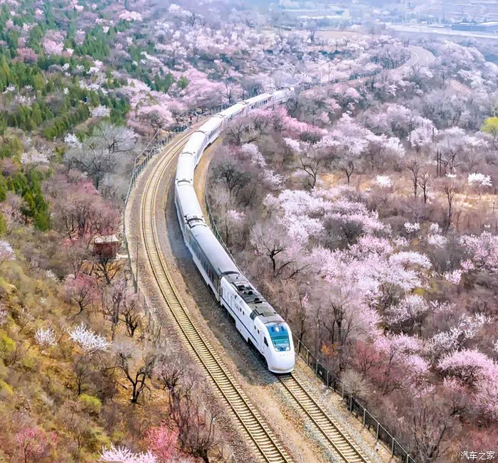 轨道两旁有粉色的山桃花、樱花和白杏,