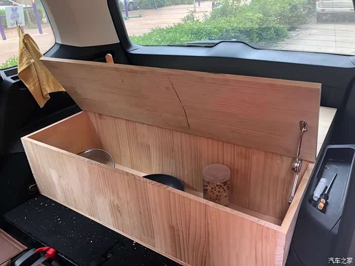 车内做了一下改动,外出露营需要带很多水。考虑到水比较多比较重放在顶箱里影响重心,不安全。于是设计了这样的后备箱结构。增加了储物的空间的同时,没有影响原车的其他功能。