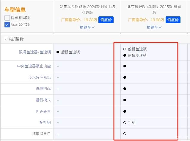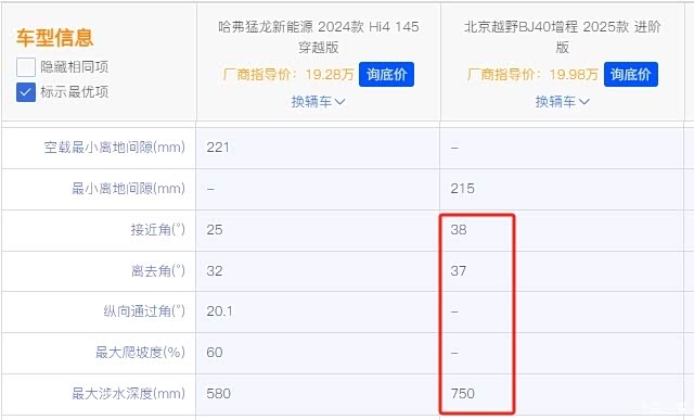 现在猛龙顶配和BJ40增程顶配的落地价格都差不多了,一个要上新,一个刚上市,正是折扣力度高的时候,对比了一下这两个车,空间猛龙略有优势,长度和宽度都长了1厘米,聊胜于无吧,但是动力、越野能力BJ40增程就厉害多了,接近角、离去角完全秒杀,而且还是大梁车身,加上一堆差速锁和越野模式,怎么感觉完全是降维打击了,之前还能说说BJ40油耗高,现在都变成混动了,油耗可真没啥差别了,现在就看看新款猛龙上市价格能不能大降价吧,不然就现在的情况,猛龙真的没啥优势。