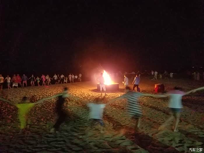 海南气息十足的沙滩篝火晚会,气氛非常活跃,大家围成圈,手拉手,一起跳起了欢快的舞蹈
