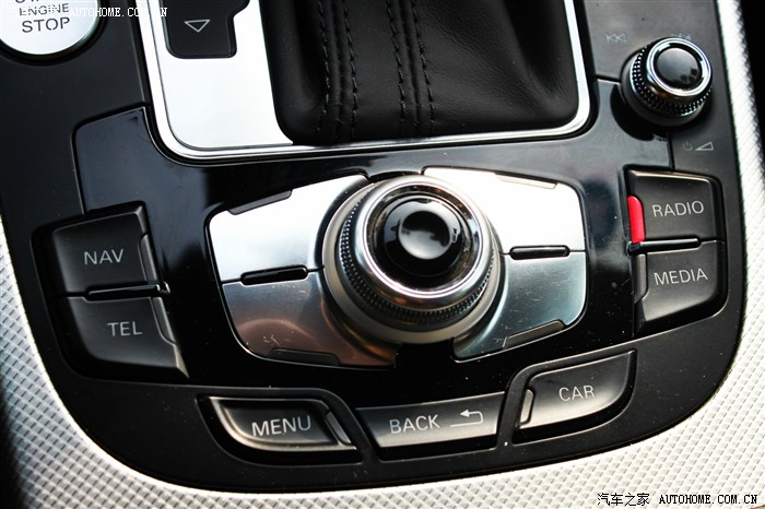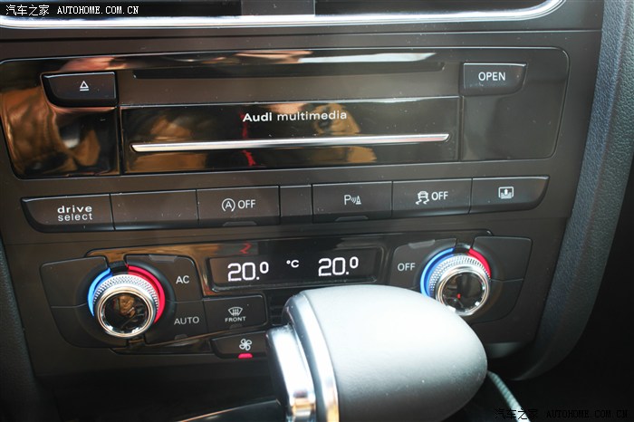 下方为空调,上方为DVD,盖板下可插2张SD卡,中间按钮从左到右为:驾驶模式选择、发动机停启、倒车影像、ESP、后电动遮阳帘