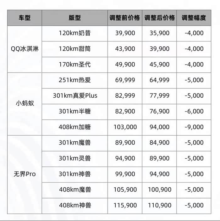 刚起来就看到奇瑞发布新能源微型纯电车型价格回调信息,奇瑞小蚂蚁价格回调幅度4000-9000元,奇瑞QQ冰淇淋官方价格回调幅度4000元,奇瑞无界Pro 价格回调幅度5000元。看到这个立马就通知了想要买QQ冰淇淋的粉丝朋友们,此时不入更待何时呢!