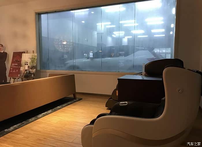 4S店的休息室,还配有按摩椅,旁边是一个玻璃墙,方便客户观察维修施工的情况。休息室还有茶水,各种零食,置身其中,能让你感觉到沃尔沃的北欧格调