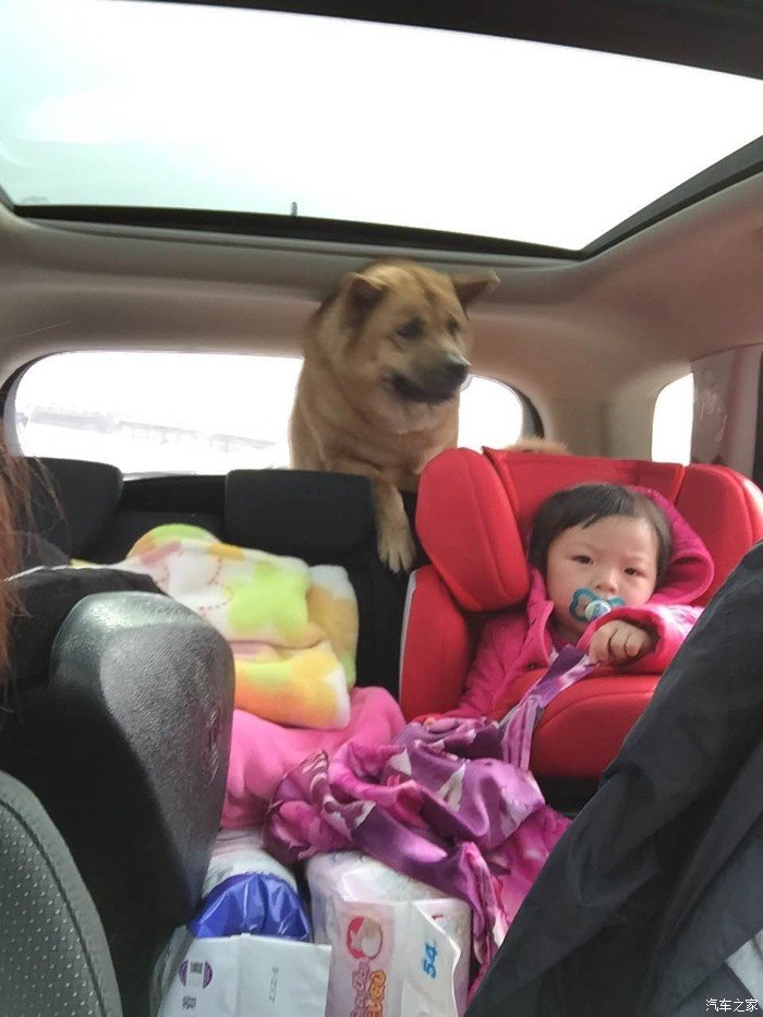 女儿在后排,儿子反过来坐的看不到,一只狗狗睡下了,一只一路看风景。