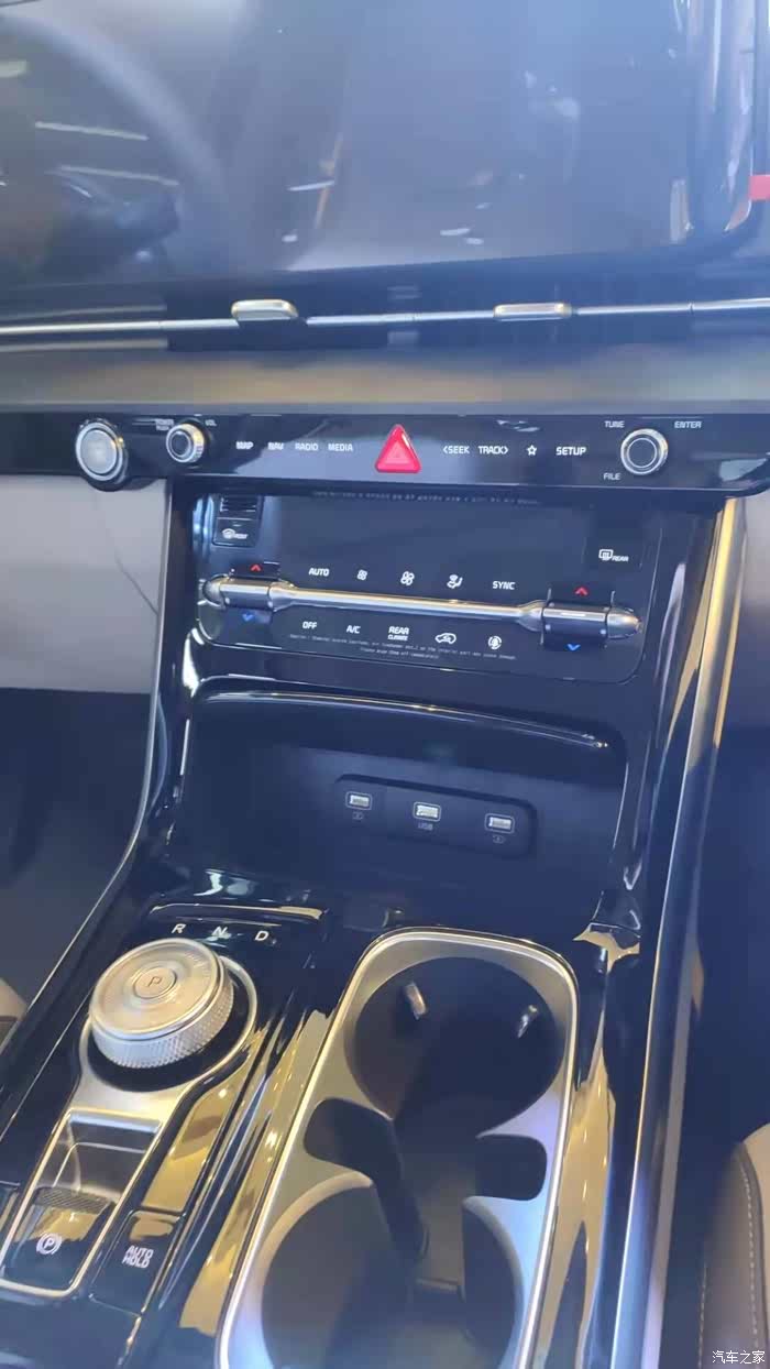 旋钮式的换挡机构和杯托占据了中部空间,相较于GL8万年的镂空,这里更有轿车的感觉。