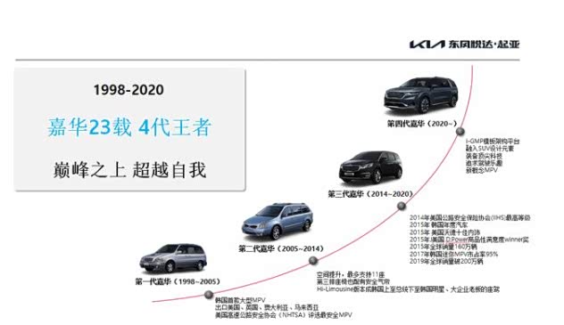 起亚嘉华,一款MPV,很多人甚至不知道他是DYK成立后发布的第二款汽车,早在2004年,第一代嘉华就在中国量产并投放市场,从这个意义上说他是不折不扣的老兵。相比同时代的对手GL8,老款嘉华没有那么商务化(1998年刚面世的时候还没MPV的概念,当时主打休闲用车),但是当时家庭MPV市场还是个空白,家庭用车还是在解决有无问题的时段。所以,老款嘉华折戟沉沙,于2011年停产,也因为这个原因,在海外继续更新的第二代第三代嘉华并没有投放到中国市场。