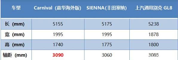 因为还没有国产量产车的数据,所以这里引用海外版的数据。可以看到相较竞品车型,嘉华的轴距略胜一筹,接近两米的宽度也超过了GL8一个档次