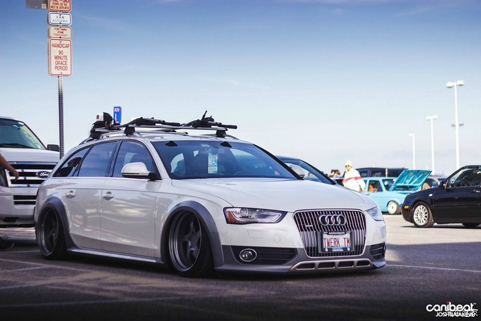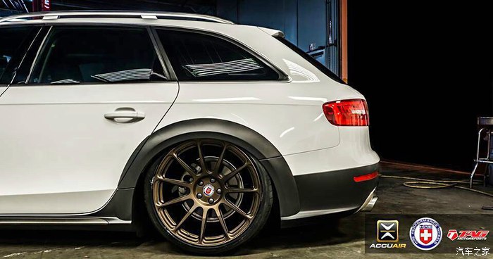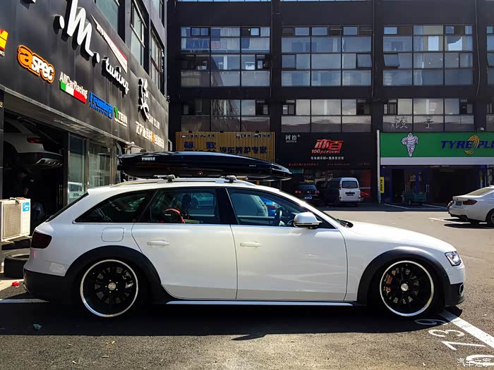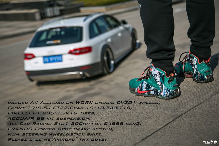 #不务正业旅行车#bagged A4 Allroad on WORK gnosis CV201 wheels,Front 19*9.5J ET22,Rear 19*10.5J ET18,PIRELLI P1 235/35/R19 Tires,ACCUAIR B8 kit suspension,All Car Racing Stg1 300p for EA888 gen3,FRANDO Forged 6pot brakes,RS4 steering&stick shift.Please call me"Airroad" thx guys!