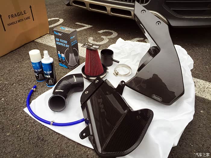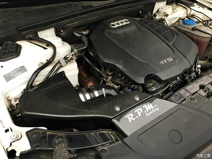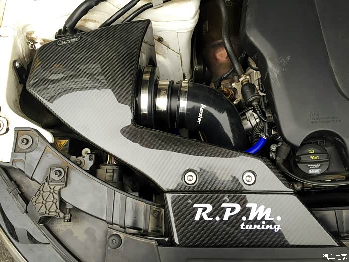 15年冬的某一天,Karztec进气套件到货,理性的选择了带碳纤维外罩的高流量冬菇套件,EA888三代机专用,滤芯可反复清洗,干碳纤维外罩有效隔绝了引擎舱的热浪,保持进气温度不受外界因素干扰,个人非常喜欢这款进气导气口的设计,高速有撞风效果,提高进气效率。这里要赞一下,三代引擎进气离涡轮本体的距离非常短,高增压大马力的必备设计。进气套件安装后转速上升速度明显提升,挂档起步涡轮起压后可以听到增压的吸气声音,收油泄压阀的泄压声也隐约可以听到,运动感爆棚。还有很关键的一点就是干碳纤维外罩实在太帅,引擎舱逼格提升,满意!