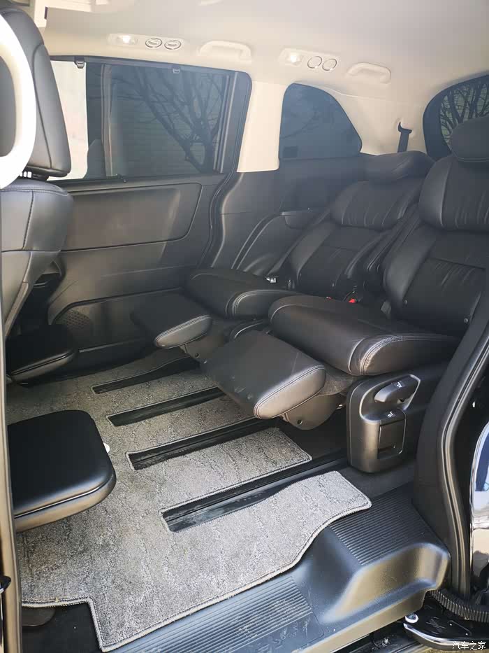 马老板家买了第一排脚托,长途觉得如果脚踝地方吊着还是不舒服,所以增加配置!自己安装还是简单!座椅调节上面比航空座椅少了, 按摩通风和加热还有座椅旋转,基本位置调节完爆其他MPV,少了新款的扶手,腾出中央通道,第三排进出方便许多!第二排扶手角度可以调节那个角度都可以满足!不喜欢皮质或者丝圈脚垫感觉质感不行,木地板又觉得有点冰冷,车也是一个小家需要温暖(钱包不支持我去装木地板啊!)!