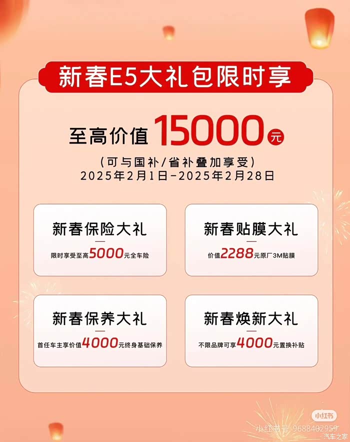 银河E5送5000元全车险+终身免费保养+4000元置换补贴,叠加0息贷款;银河星舰7 EM-i限时9.98万起,送8800元16扬声器音响,首任车主还送充电桩安装服务,性价比超高。