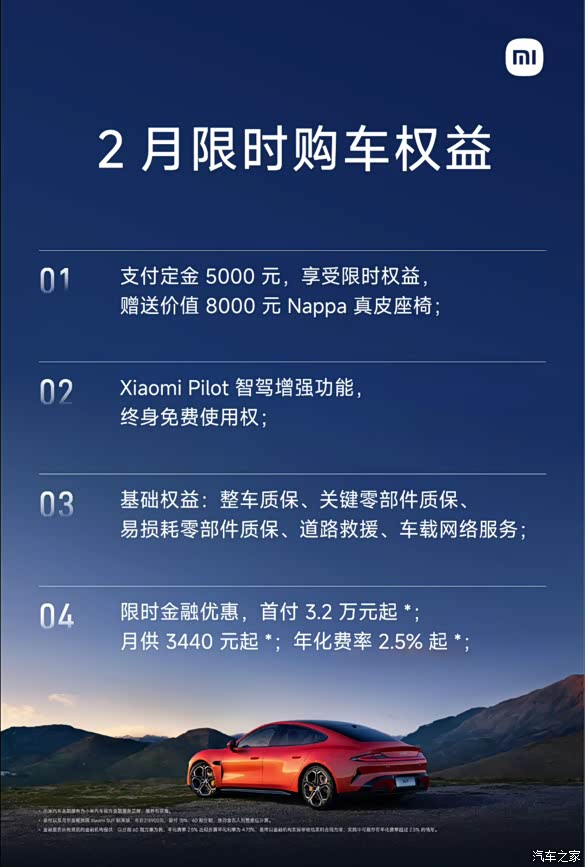 小米SU7:全系送8000元Nappa真皮座椅+智驾功能终身免费,科技控必冲。
