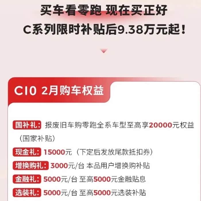 零跑C系列:旧车报废补贴2万+现金直降1.5万,C10到手价不到10万,堪称“价格屠夫”。