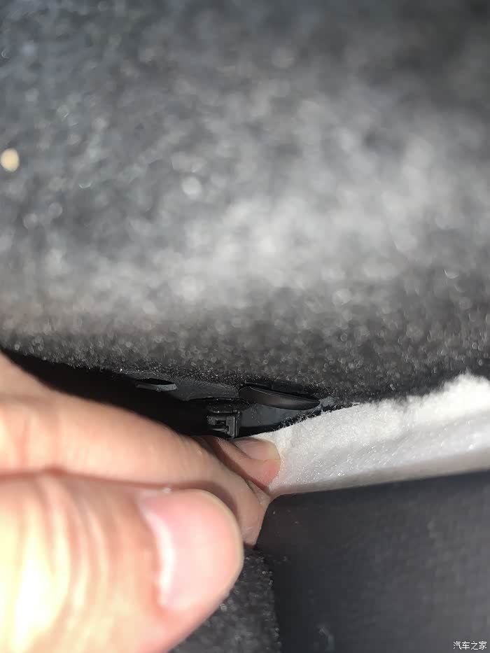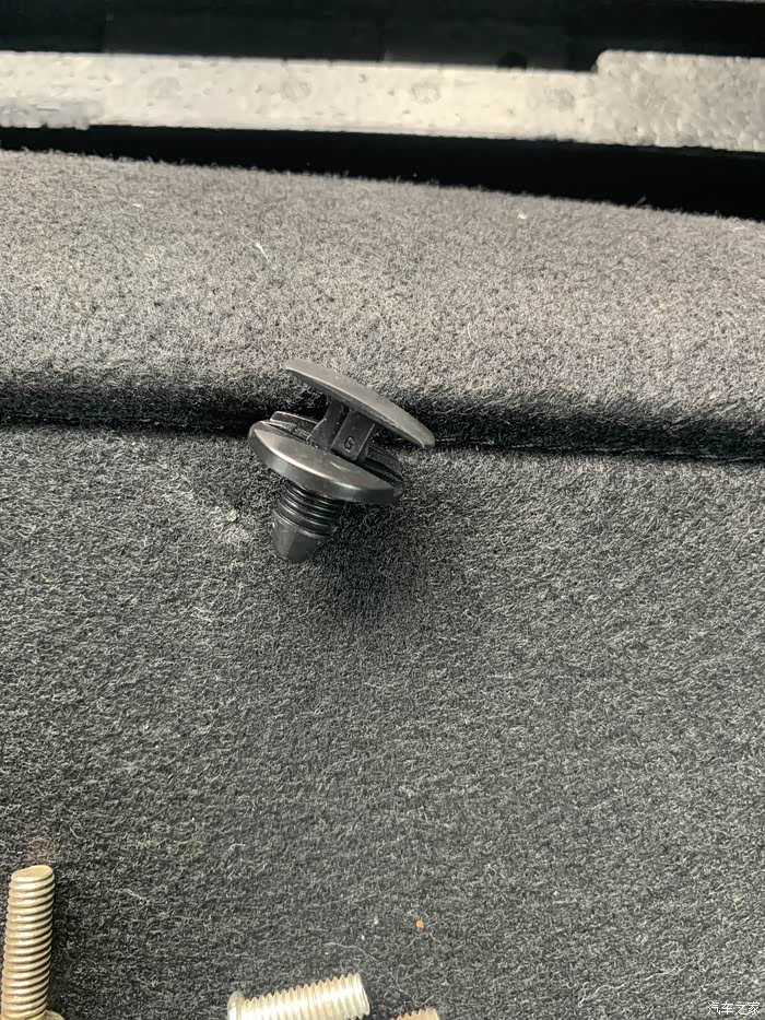 首先把后背箱的垫子和泡沫架子移走,放倒后排座椅,后座的毛毡与车架链接处有2个塑料膨胀钉,这个螺钉必须取下,取这个膨胀螺钉是需要技巧的,螺钉中间有个小卡钉,先拨开小卡丁,缩小膨胀钉的张力,再把膨胀钉拔下来。