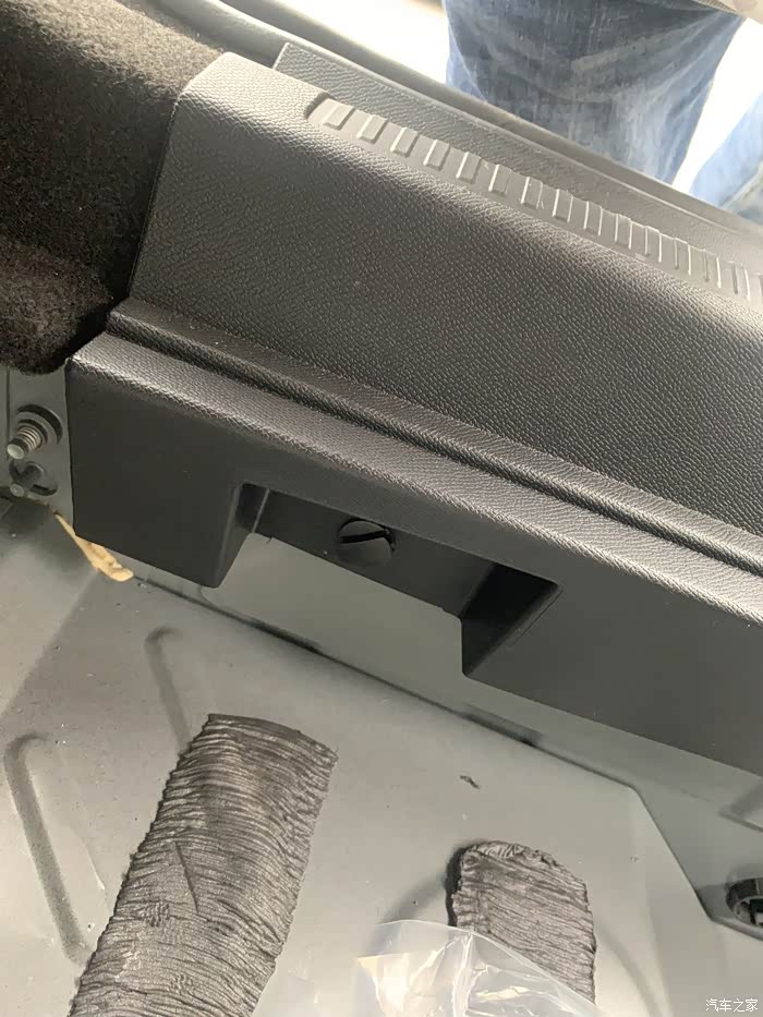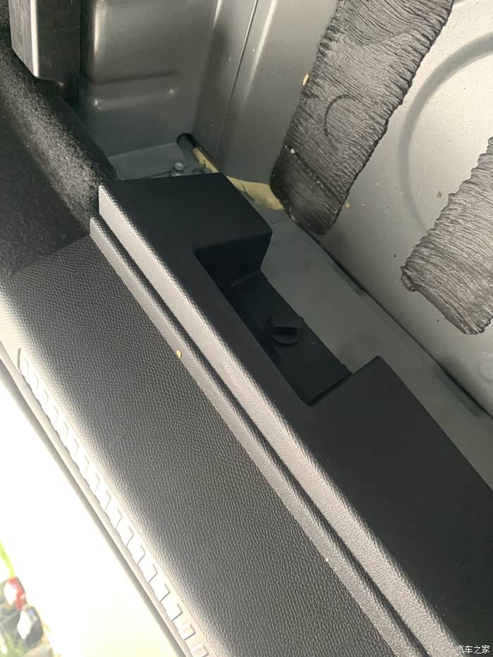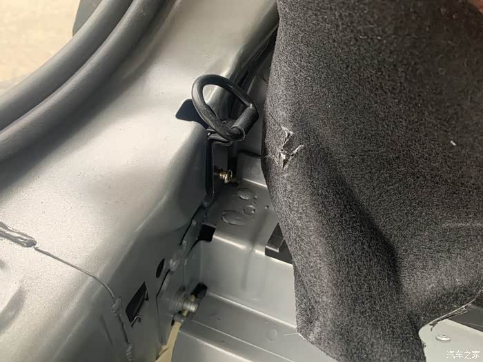 然后拨开毛毡就可以看到,原车预留的锚环安装位置,螺丝口也是预留的,螺丝需要一颗0.5厘米直径的,锚环上有个凸出的卡口,卡到原车锚环预留处,柠上螺丝,把锚环从毛毡口整出来。