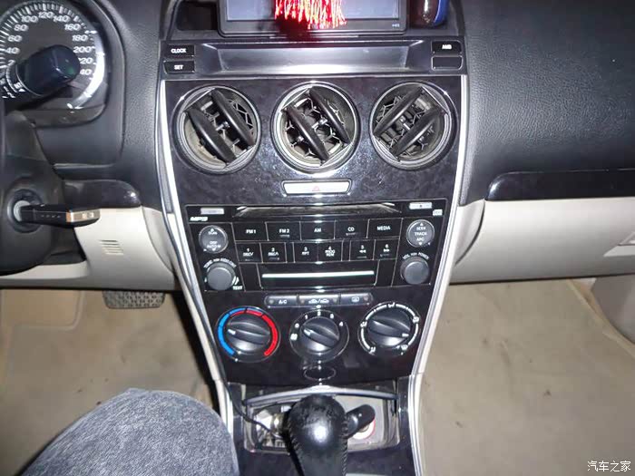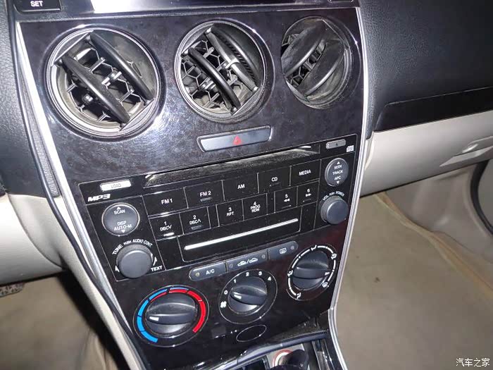 中控面板是带有纹路的钢琴漆,比后面改款马六换车磨砂面板档次要高很多,比阿特兹的塑料面板质感也更好