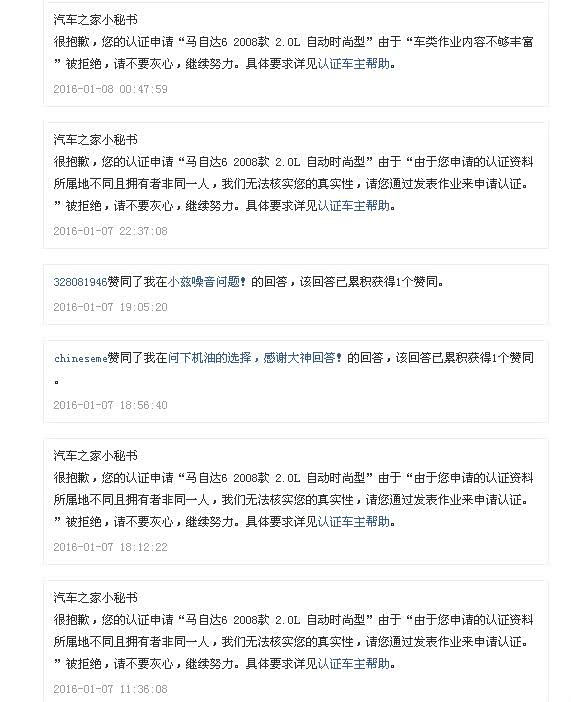 最近才发现原来之家可以认证多款车子,作为一个家里买车必买马自达的十年超级马粉,必须将现役车辆全部认证一下。之家多种认证方式里最快捷的自然是上传行车证,星骋和CX5很快就认证通过了。但是08款老马六一直没通过,认证了四次,被驳回了四次,系统留言如下,实在郁闷!