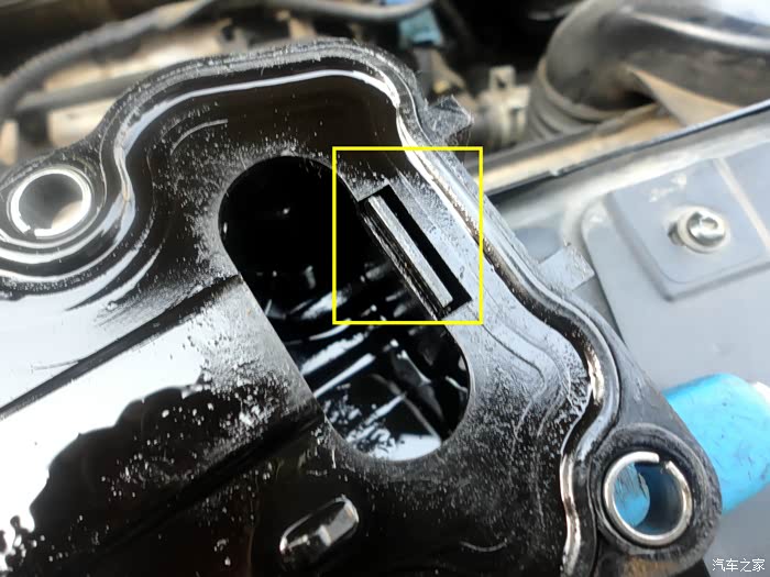 拔掉废气管后,能明显的看见螺丝的位置,这个小标记上面怎还有油渍??????